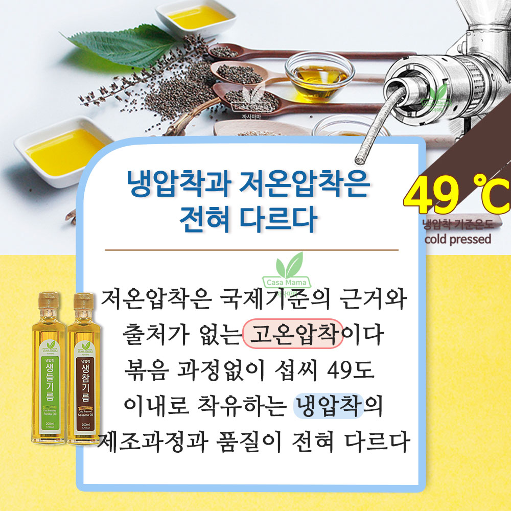 가장 건강한 방식으로 만든 신선한 들기름 참기름의 선택 기준과 방법은 압착방식과 압착온도를 확인한 후 구입하는 것이다. 들기름과 참기름 등 모든 오일의 품질과 신선도의 절대적인 기준은 압착방식과 압착온도에 달려있기 때문이다. 들기름과 참기름 등 모든 오일의 압착분류 기준온도는 섭씨 49도이다. 압착은 온도를 의미하는 것이다.압착온도 기준인 섭씨 49도 이내이면 냉압착, 그 이상이면 고온압착이다. 국제적인 압착방식 분류 기준은 냉압착과 고온압착 단 두 가지이다. 저온압착, 생냉압착 전통압착 등은 국제적인 압착방식의 기준에도 없으며, 근거와 출처가 없다. 저온압착, 생냉압착 전통압착 등은 명칭과 다르게 홍보용, 마테팅 용어에 불과하며, 고온압착 착유기로 제조한다는 점에 주의가 필요하다 냉압착과 고온압착은 착유기기 자체가 다르며, 제조법이 다르다 냉압착의 대표적인 증거는 바로 냉압착 착유기와 냉압착 깻묵이다. 냉압착 유사품은 착유기와 냉압착 깻묵을 공개하거나 보여주지 않는다. 저온압착이란 무엇인가? 들기름 참기름을 구입할 때 제품을 살펴보면 '냉압착', '저온압착', '압착' 등의 명칭이 붙어 있다. 소비자는 이러한 용어들로 식용유를 구분하기 어렵고 혼란스럽다. 국제적으로 통용되는 압착방식은 재료를 분쇄하여 기름을 짜내는 온도에 따라 'cold pressed'와 'Hot pressed' 두 가지만으로 분류하고 있다. 이 기준 온도는 49°C(120°F)이며, 우리나라에서는 'cold pressed'는 냉압착으로 'Hot pressed'는 고온압착'으로 불리고 있다. 그런데 우리나라에서는 냉압착과 고온압착 외에 최근 '저온압착'이라는 용어가 사용되고 있다. 국제적 분류와 국내 학술과 연구자료에서도 용어 자체를 찾아볼 수 없다. '저온압착'을 두고 볶음과 압착에 대한 오해와 혼동이 있는 게 사실이다. 제조과정에서 볶음이나 고온압착을 하면 들기름 제조과정에서 볶음(roasting)이나 높은 온도로 고온압착을 하면 가열 온도에 따라 오메가3의 성분이 파괴되어 트랜스 지방으로 바뀌고, 오메가3의 함유량은 감소한다. 압착을 cold pressed와 hot pressed로 분류하는 것은 유럽에서 시작되었으며, 이를 우리말로 표현하면서 압착(pressed)의 종류와 용어의 혼란을 겪고 있는 게 현실이다. 들기름과 참기름 등의 각종 식물성 기름은 제조할 때 온도에 의해 절대적인 영향을 받는다. 특히 압착 온도는 품질을 결정짓는 중요한 요인이다. 우려스러운 점은 '저온압착'과 냉압착(cold pressed) 제품의 질에 현격한 차이가 있음에도 소비자들이 비슷한 제품으로 혼동하여 피해를 입을 수도 있다는 점이다. 분명한 점은 '저온압착'은 국제적인 분류에 의하면 고온압착(Hot pressed)에 해당된다. 국내에는 이러한 용어에 대한 명확한 지침이나 규제가 마련되어 있지 않다. 하지만 머지않아 국내에도 이러한 규정이 마련될 것으로 예상된다. ‘저온압착 말고 냉압착 생들기름’을 원하는 프로슈머 요즘의 소비자들은 전문가 못지 않게 상품에 대한 전문 지식을 가지고 문제점을 정확하게 꿰뚫고 있다. 이들이 바로 깐깐하고 똑똑한 소비자인 프로슈머(prosumer)이다. 프로슈머, 이들은 시장에 나온 물건을 선택하여 소비하는 수동적인 소비자가 아니라 자신의 취향과 욕구에 맞는 물건을 스스로 창조해나가는 능동적 소비자이기도 하다. 냉압착 생들기름이란 ▲원산지가 확실한 국내산 재료 ▲볶는 과정이 없을 것 ▲49°C 이내인 냉압착(cold pressed) 전용착유기로 제조한 것 등등 이다. 그리고 이 외에도 필터 공정까지 꼼꼼하게 확인 후 구입을 결정한다. 이 외에도 깐깐한 소비자들은 생들기름의 증거로 깻묵에 주목한다. 깻묵과 깨의 색상의 같고, 깻묵에서 고소한 냄새가 있는지, 그리고 판매자의 깻묵 공개여부 등을 살펴본 후 구입을 결정한다. #냉압착 #냉압착온도기준 #냉압착과고온압착의차이 #국제적압착분류기준 #생들기름생참기름선택방법 #저온압착의문재점 #고온압착의문제점 #산패 #들기름참기름산패원인 #가열산화 #고소한들기름의문제점 #깨를왜볶아서만들까 #냉압착과저온압착의차이 #냉압착생들기름확인법 #냉압착의증거 국산 냉압착 생들기름 냉압착 생참기름 전문점 까사마마 www.casamama.co.kr